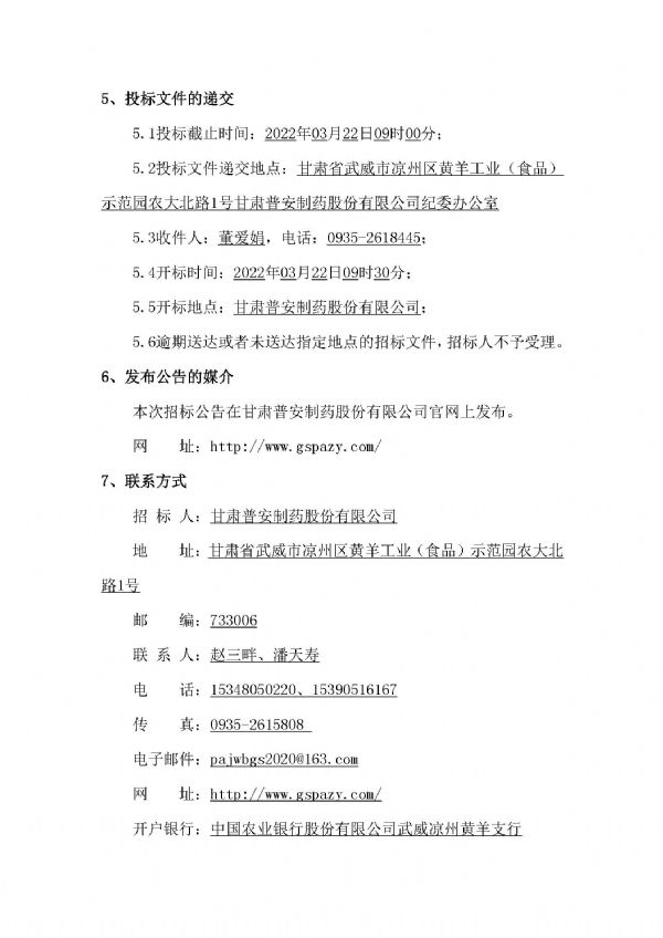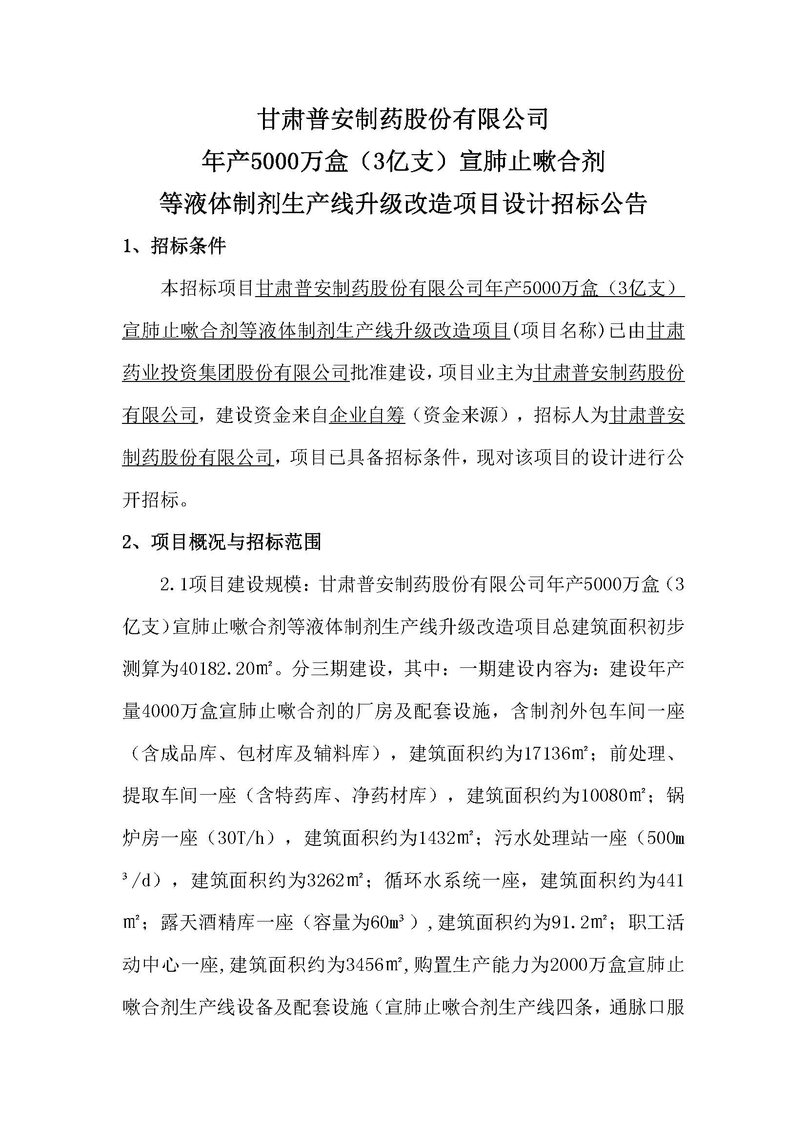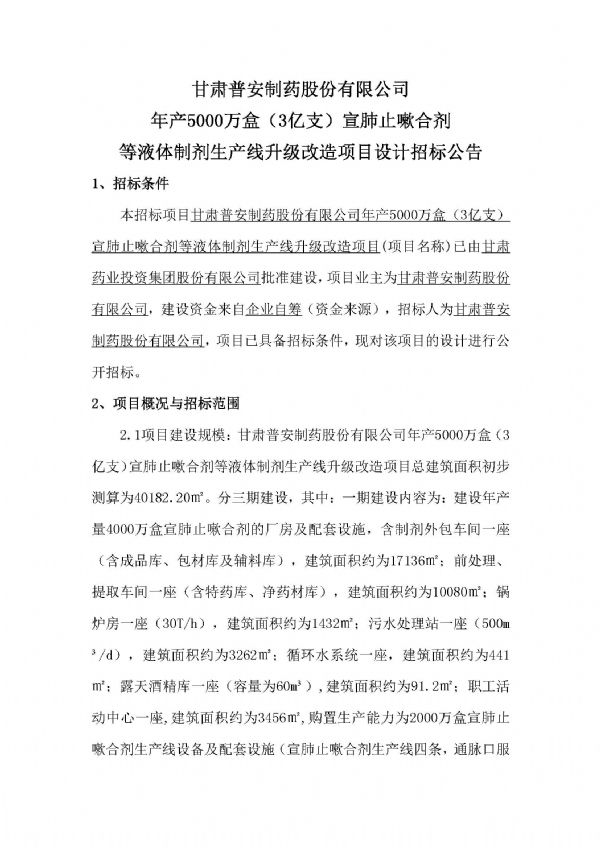 甘肅普安制藥股份有限公司年產5000萬盒(3億支)宣肺止嗽合劑等液體制劑生產線升級改造項目設計招標公告