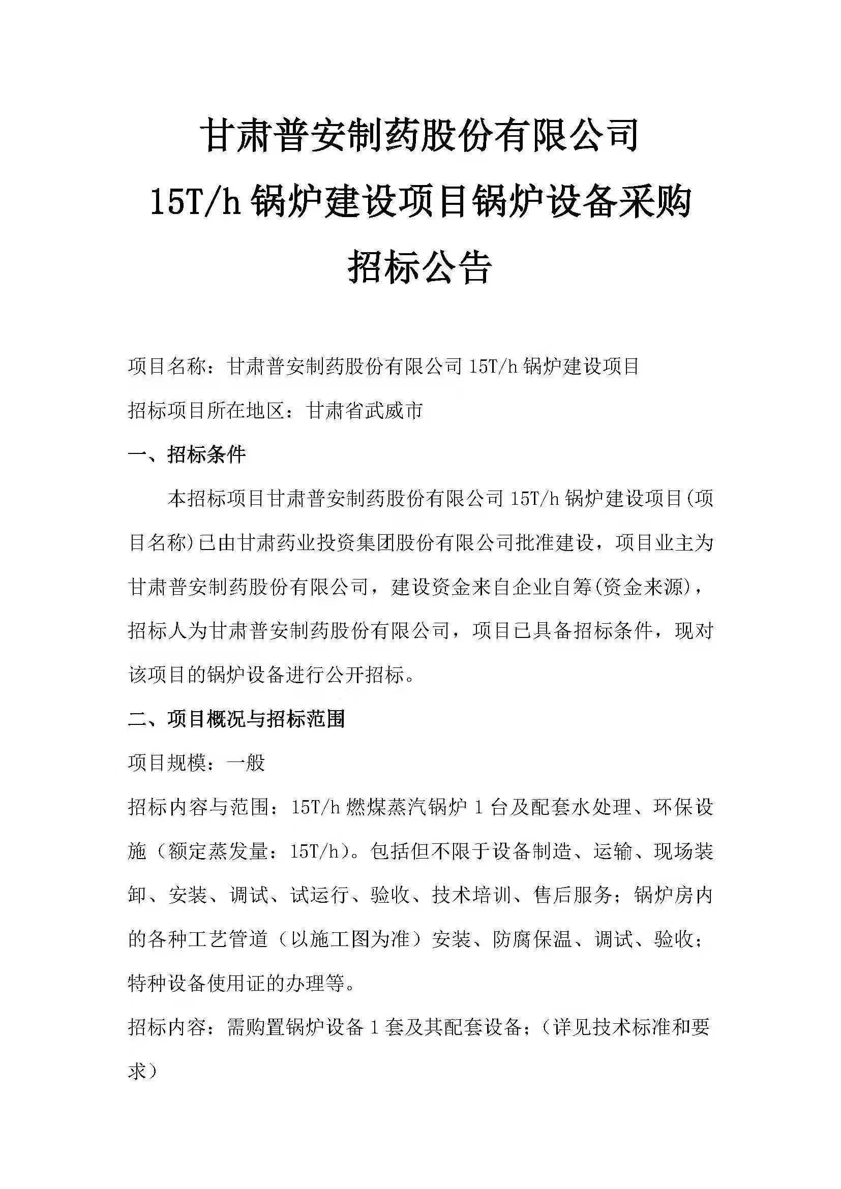 甘肅普安制藥股份有限公司15T/h鍋爐建設(shè)項(xiàng)目鍋爐設(shè)備采購(gòu)招標(biāo)公告