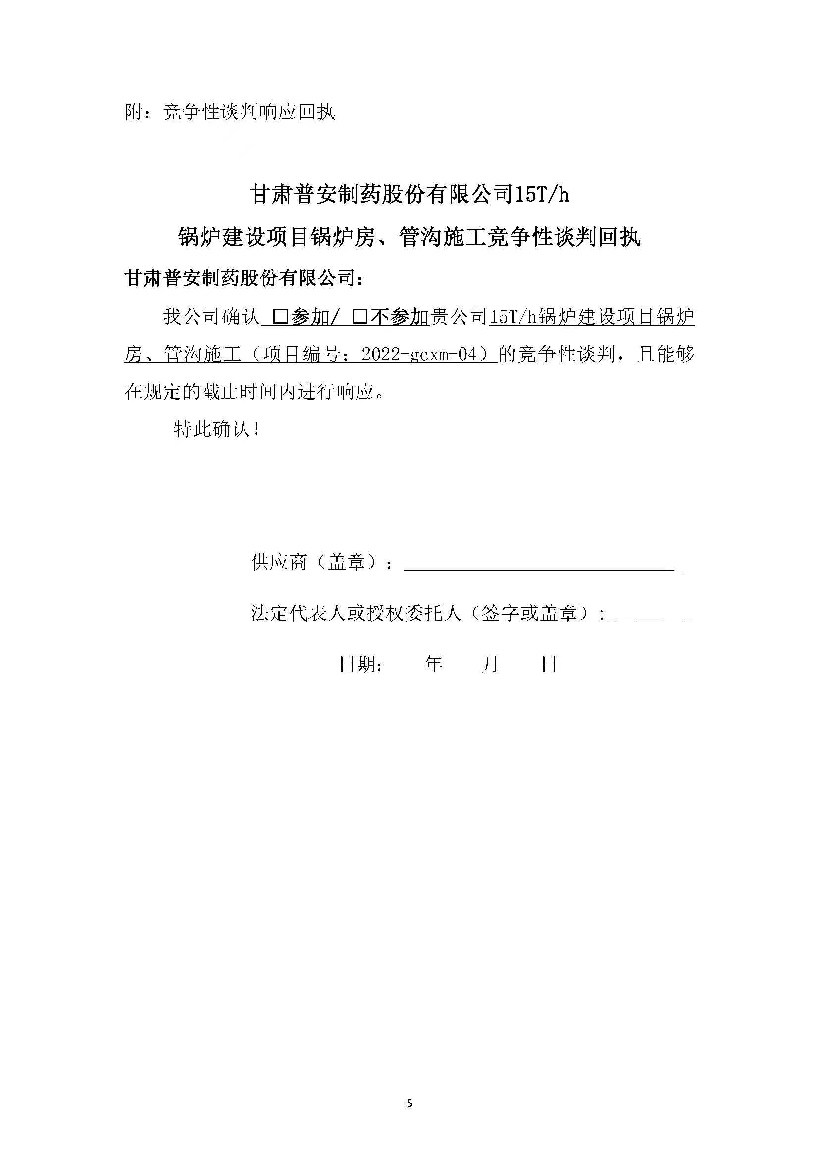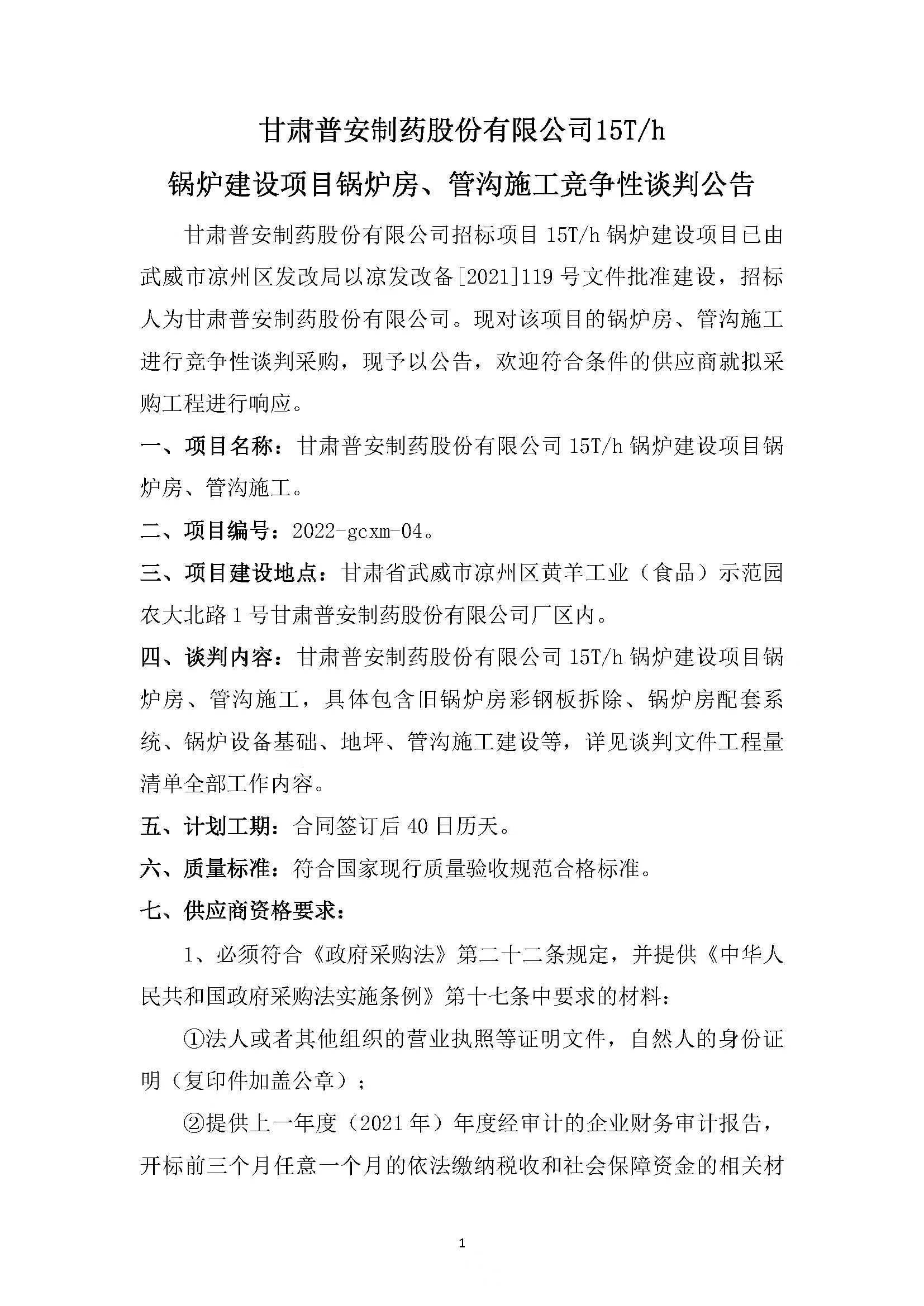甘肅普安制藥股份有限公司15T/h鍋爐建設(shè)項(xiàng)目鍋爐房、管溝施工競爭性談判公告