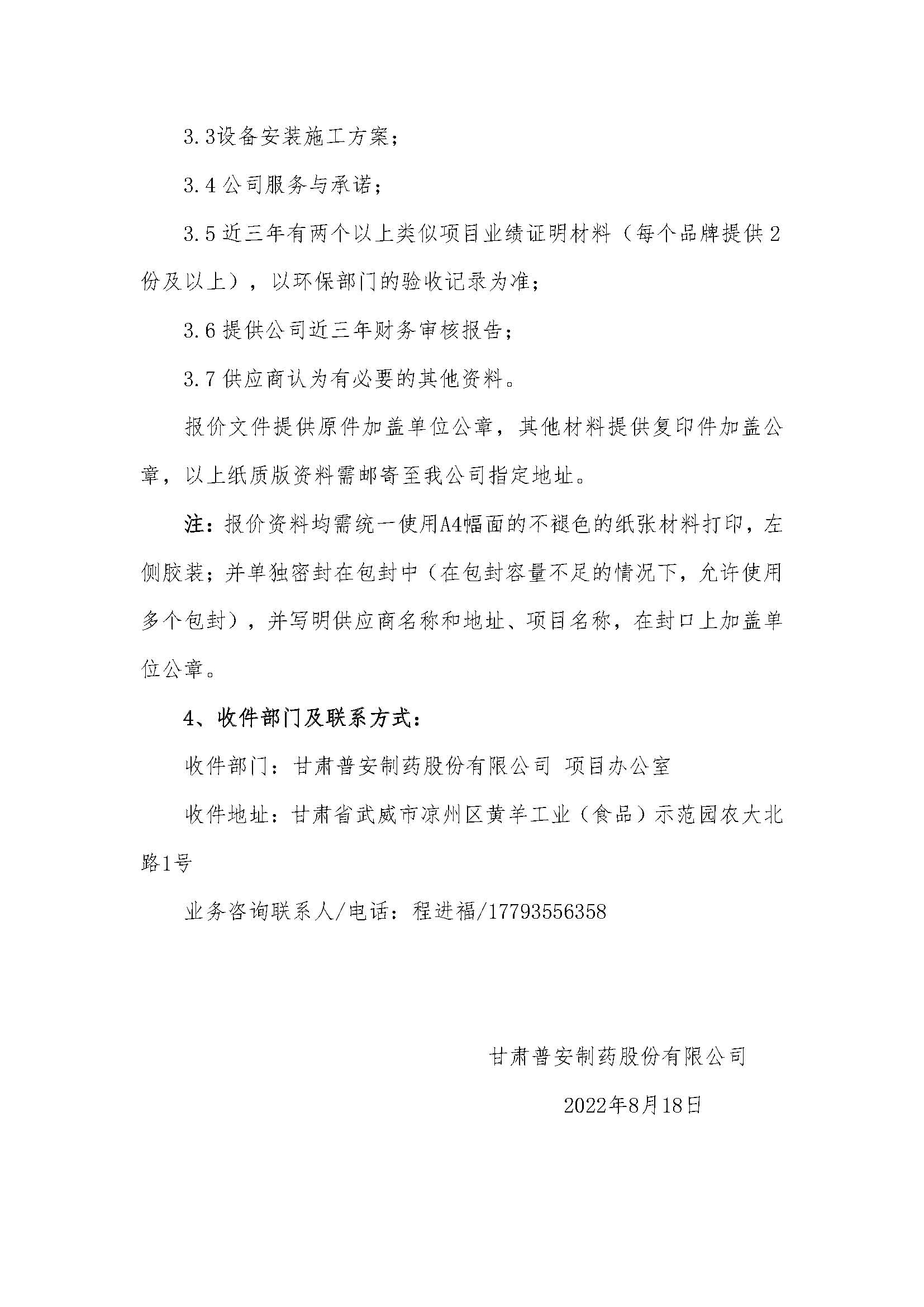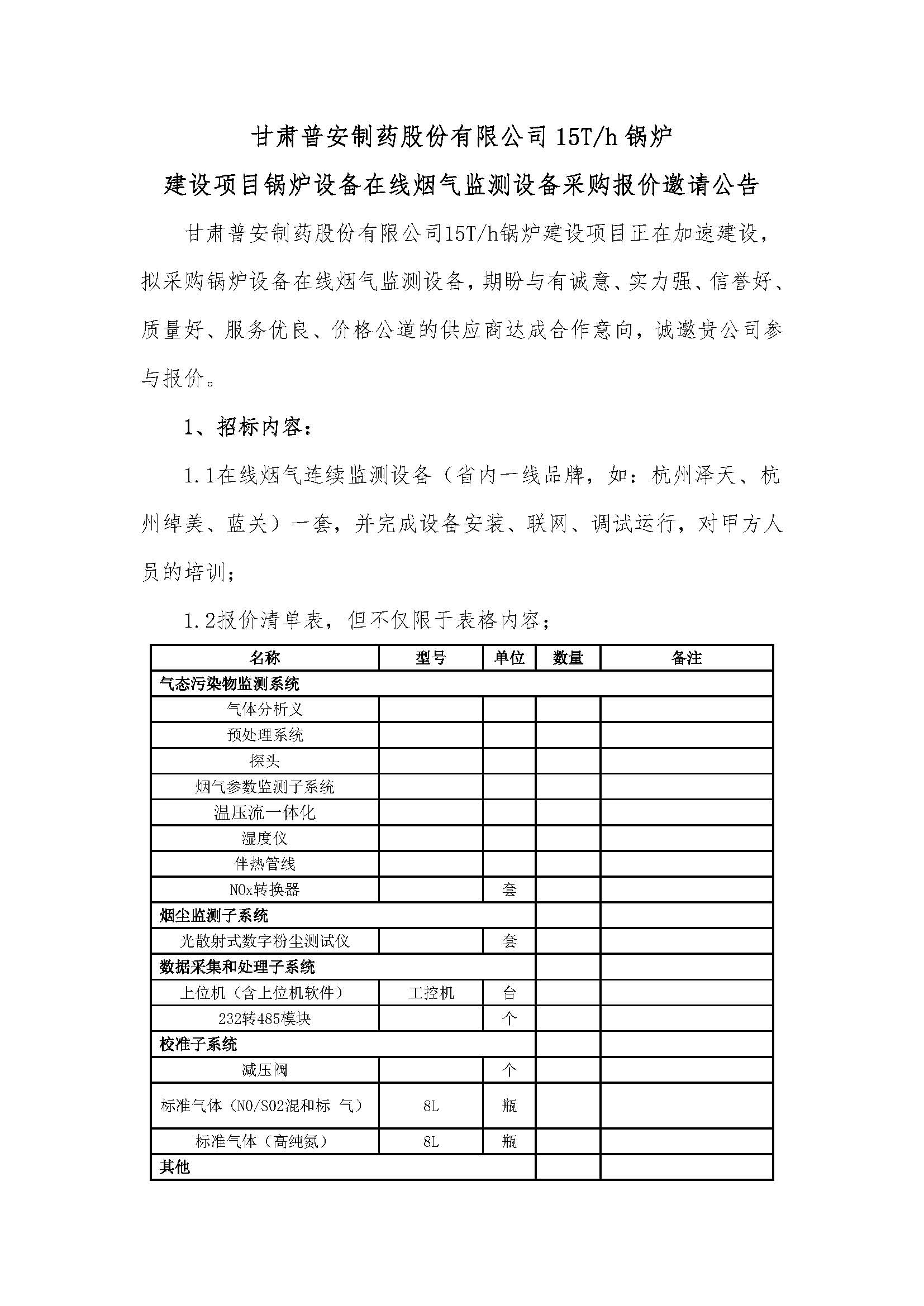 甘肅普安制藥股份有限公司15T/h鍋爐建設項目鍋爐設備在線煙氣監測設備采購報價邀請公告