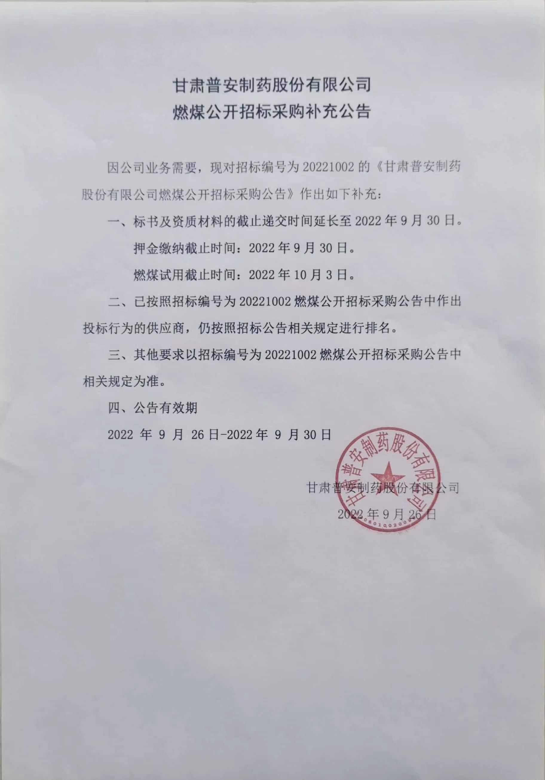 甘肅普安制藥股份有限公司燃煤公開招標采購補充公告