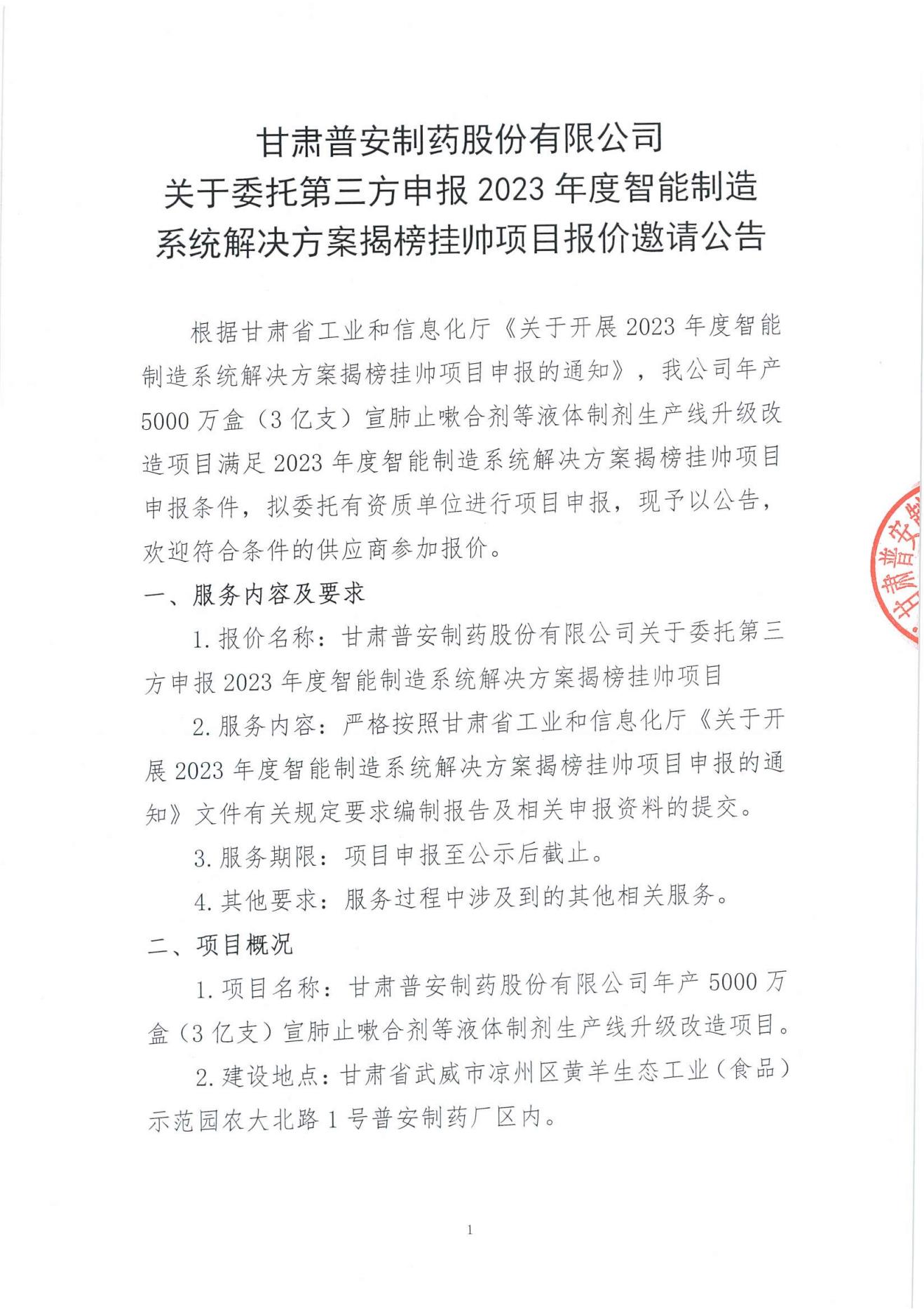 甘肅普安制藥股份有限公司關(guān)于委托第三方申報(bào)2023年度智能制造系統(tǒng)解決方案揭榜掛帥項(xiàng)目報(bào)價(jià)邀請(qǐng)公告