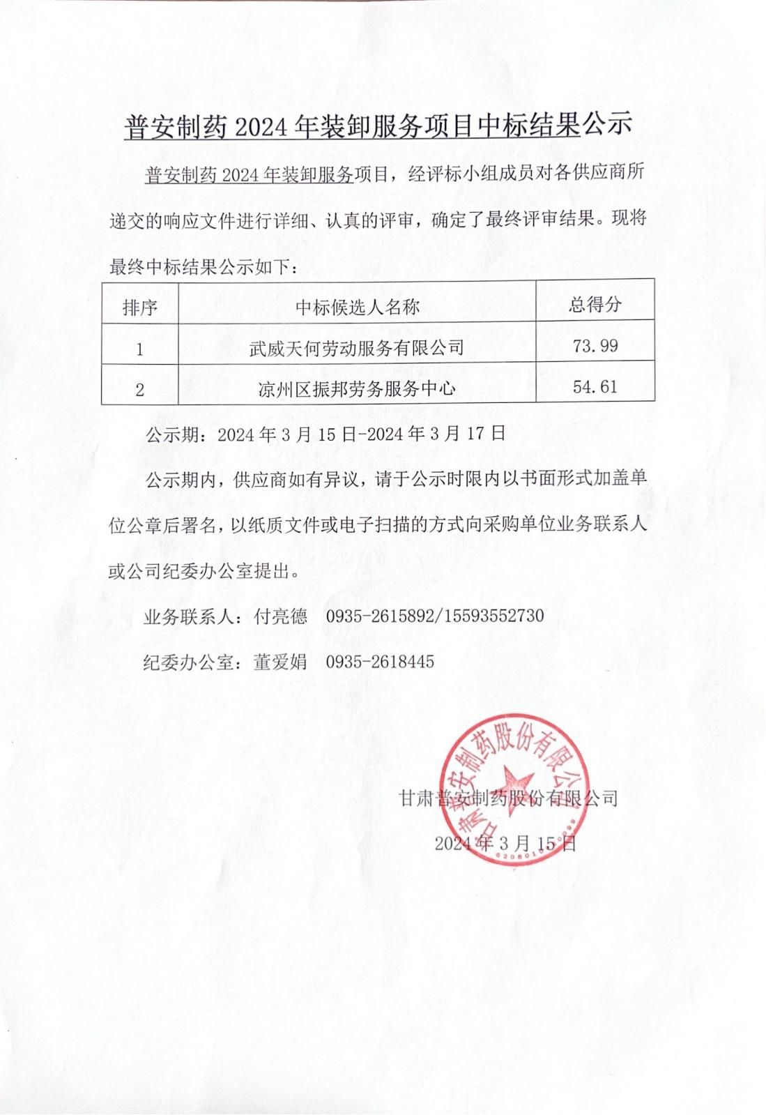 普安制藥2024年裝卸服務項目中標結果公示