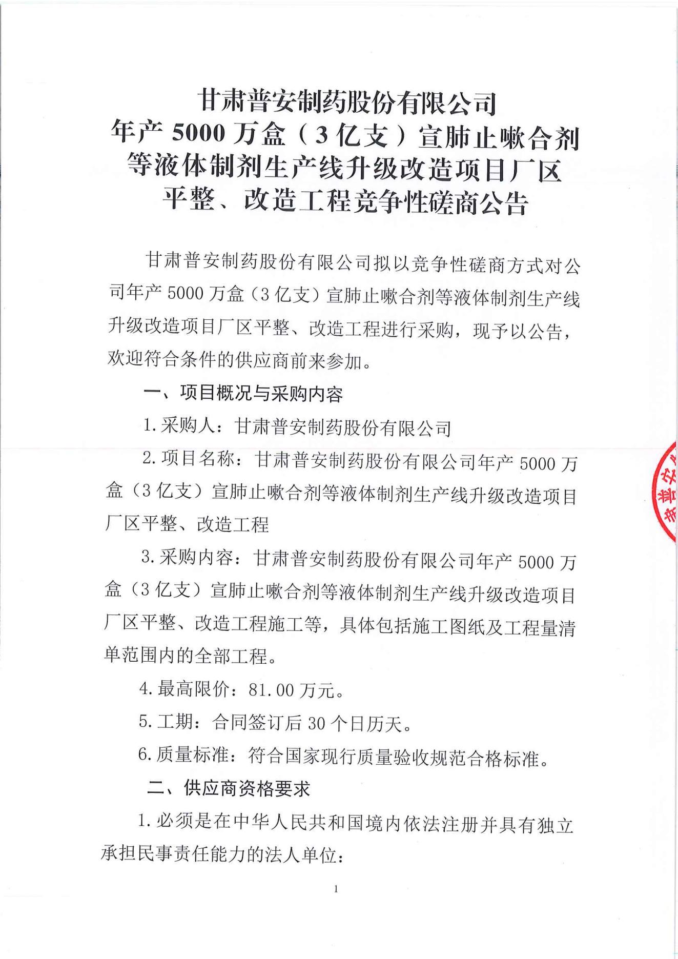 甘肅普安制藥股份有限公司年產(chǎn)5000萬(wàn)盒(3億支)宣肺止嗽合劑等液體制劑生產(chǎn)線(xiàn)升級(jí)改造項(xiàng)目廠(chǎng)區(qū)平整、改造工程競(jìng)爭(zhēng)性磋商公告
