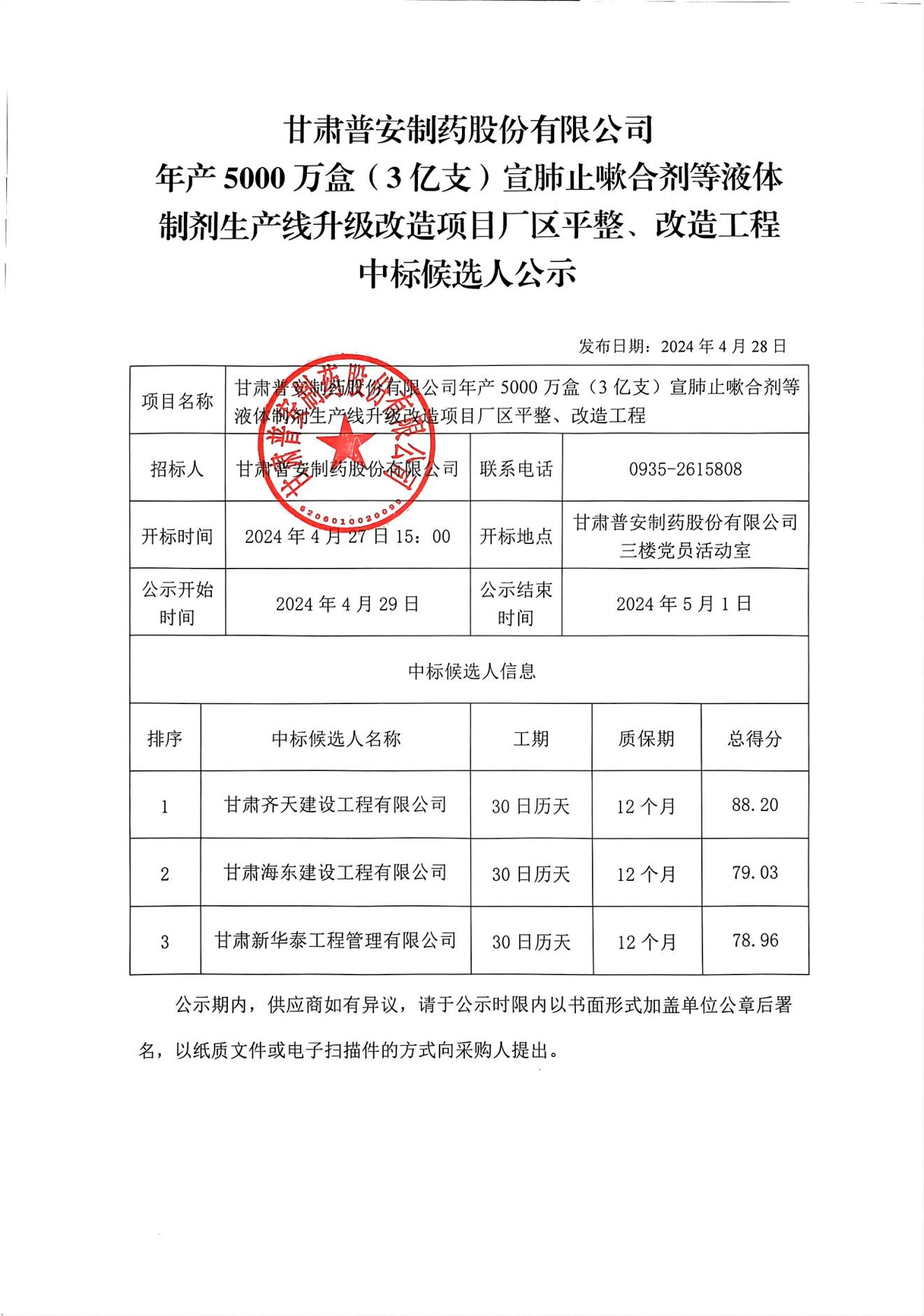 甘肅普安制藥股份有限公司年產5000萬盒(3億支)宣肺止嗽合劑等液體制劑生產線升級改造項目廠區平整、改造工程中標候選人公示