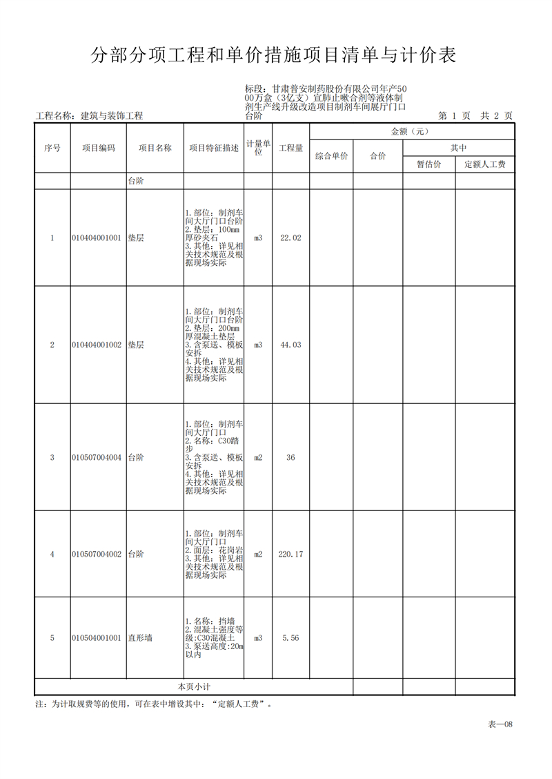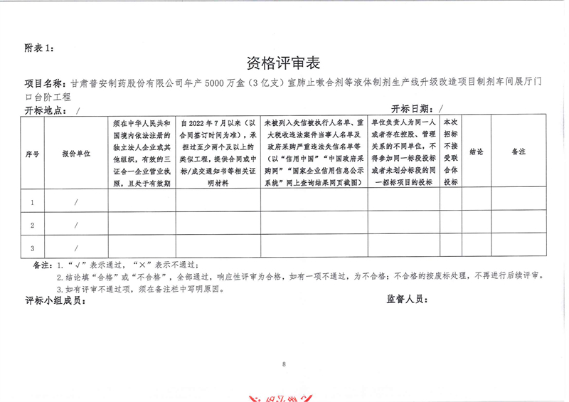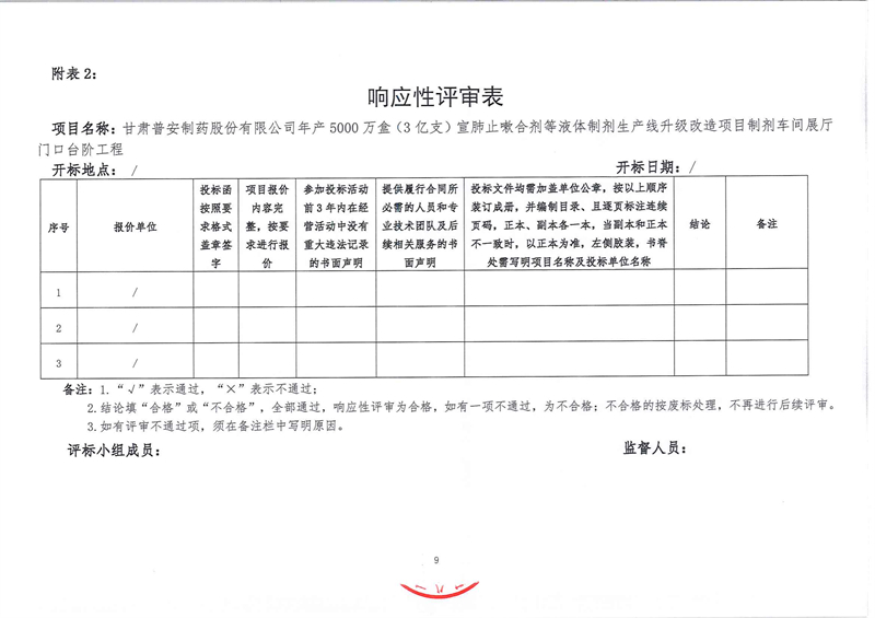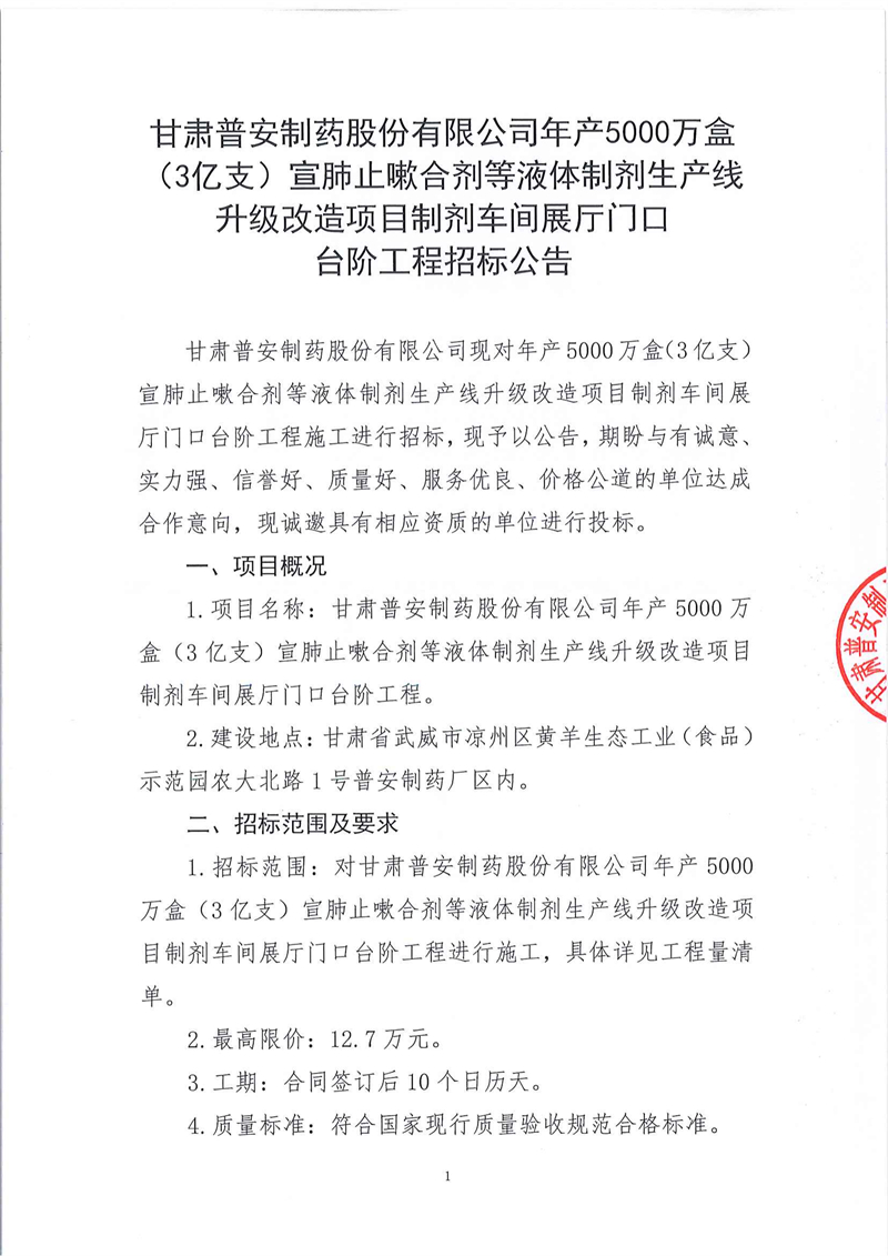 甘肅普安制藥股份有限公司年產5000萬盒(3億支)宣肺止嗽合劑等液體制劑生產線升級改造項目制劑車間展廳門口臺階工程招標公告
