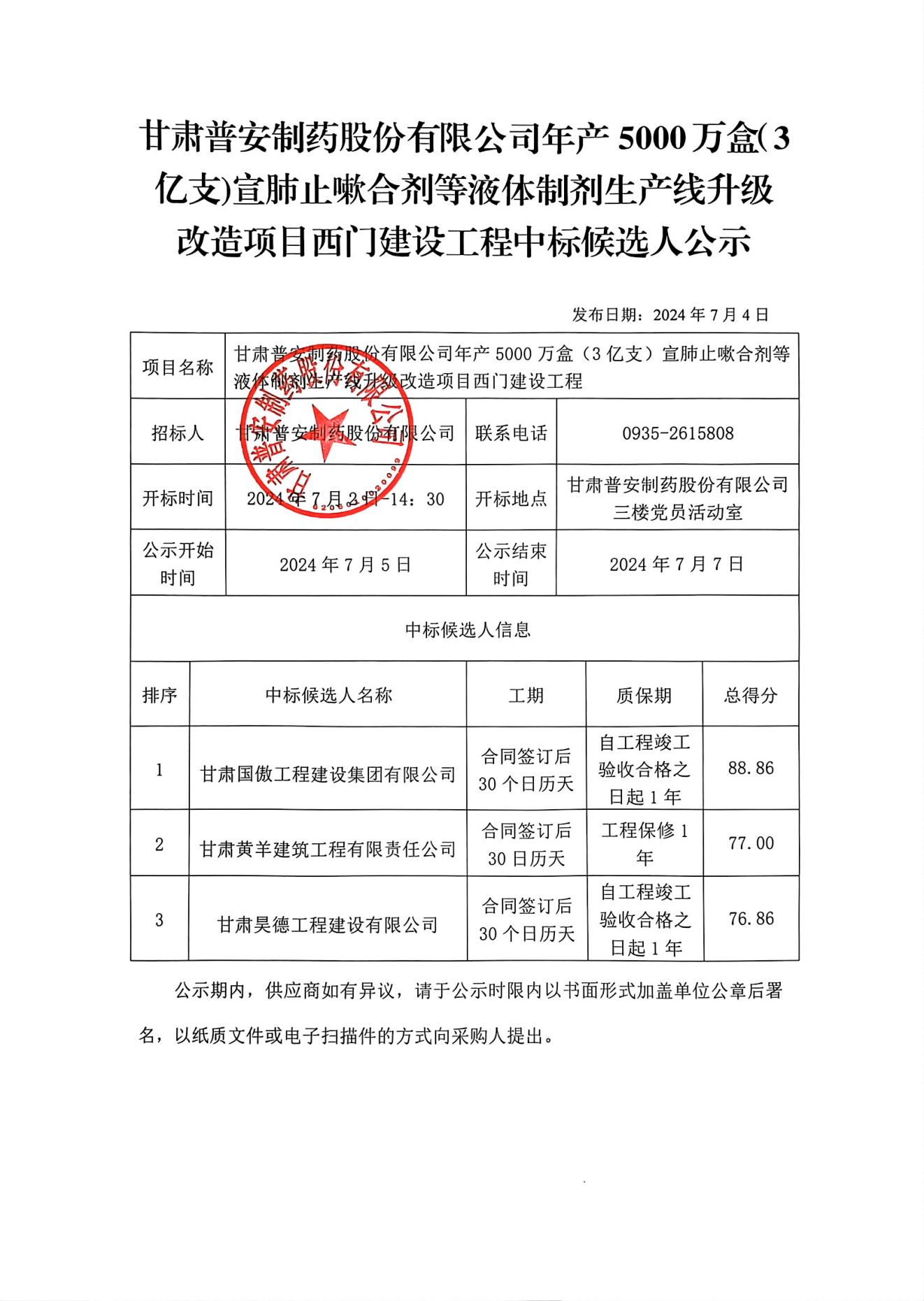甘肅普安制藥股份有限公司年產(chǎn)5000萬盒(3億支)宣肺止嗽合劑等液體制劑生產(chǎn)線升級改造項目西門建設(shè)工程中標候選人公示