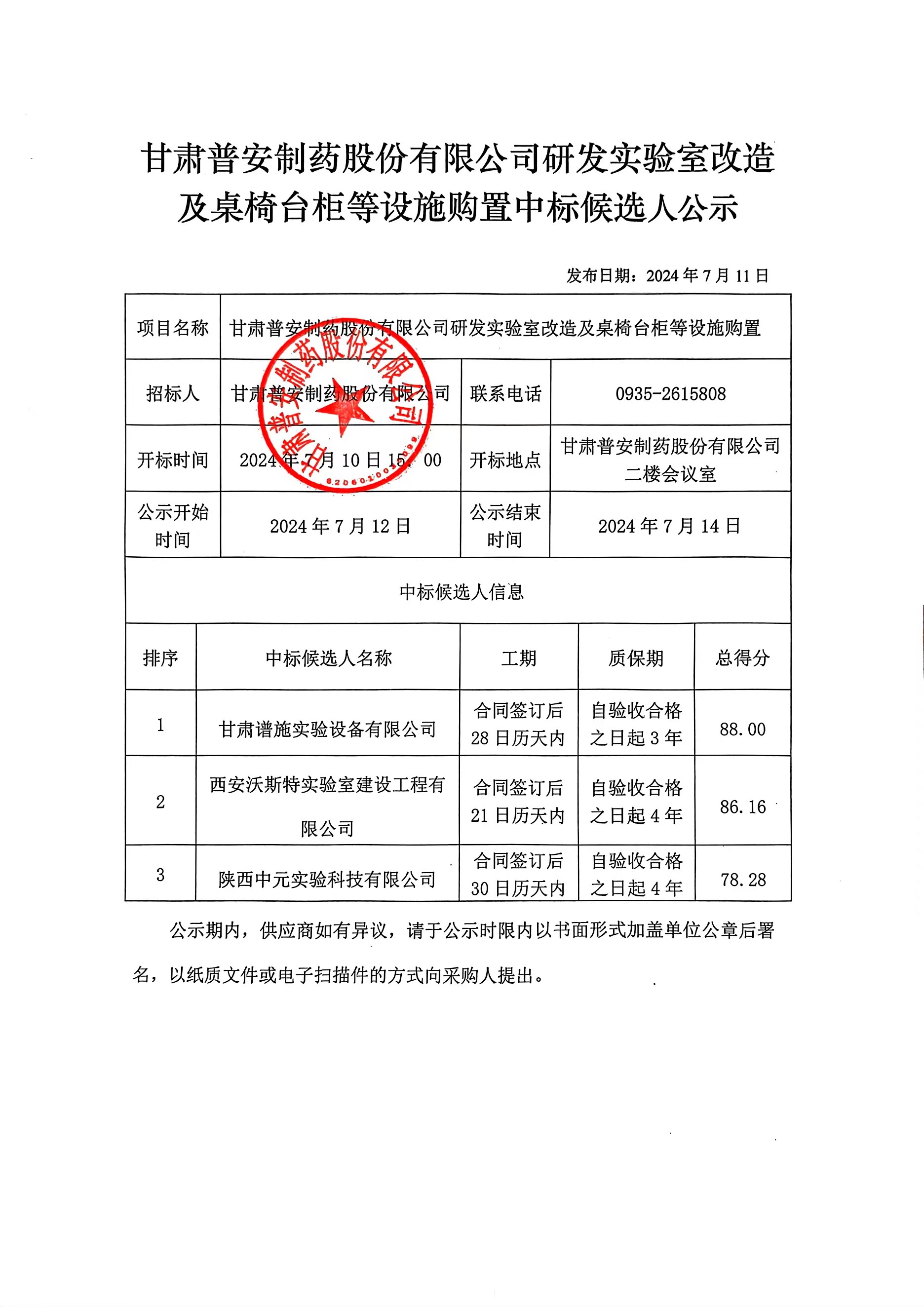 甘肅普安制藥股份有限公司研發實驗室改造及桌椅臺柜等設施購置中標候選人公示