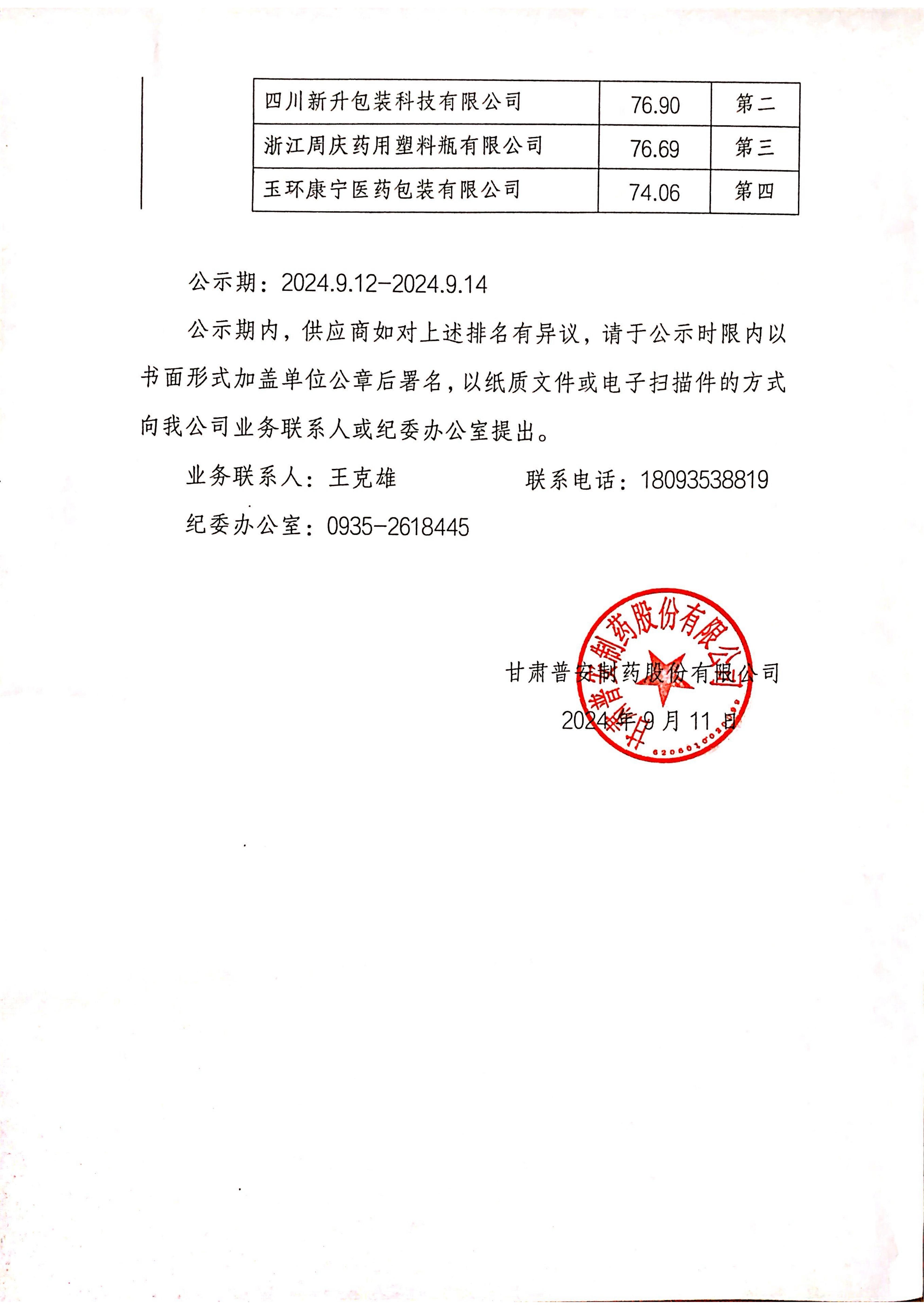 甘肅普安制藥股份有限公司2024年8月1000萬盒宣肺止嗽合劑包裝材料補充招標(biāo)采購結(jié)果公示