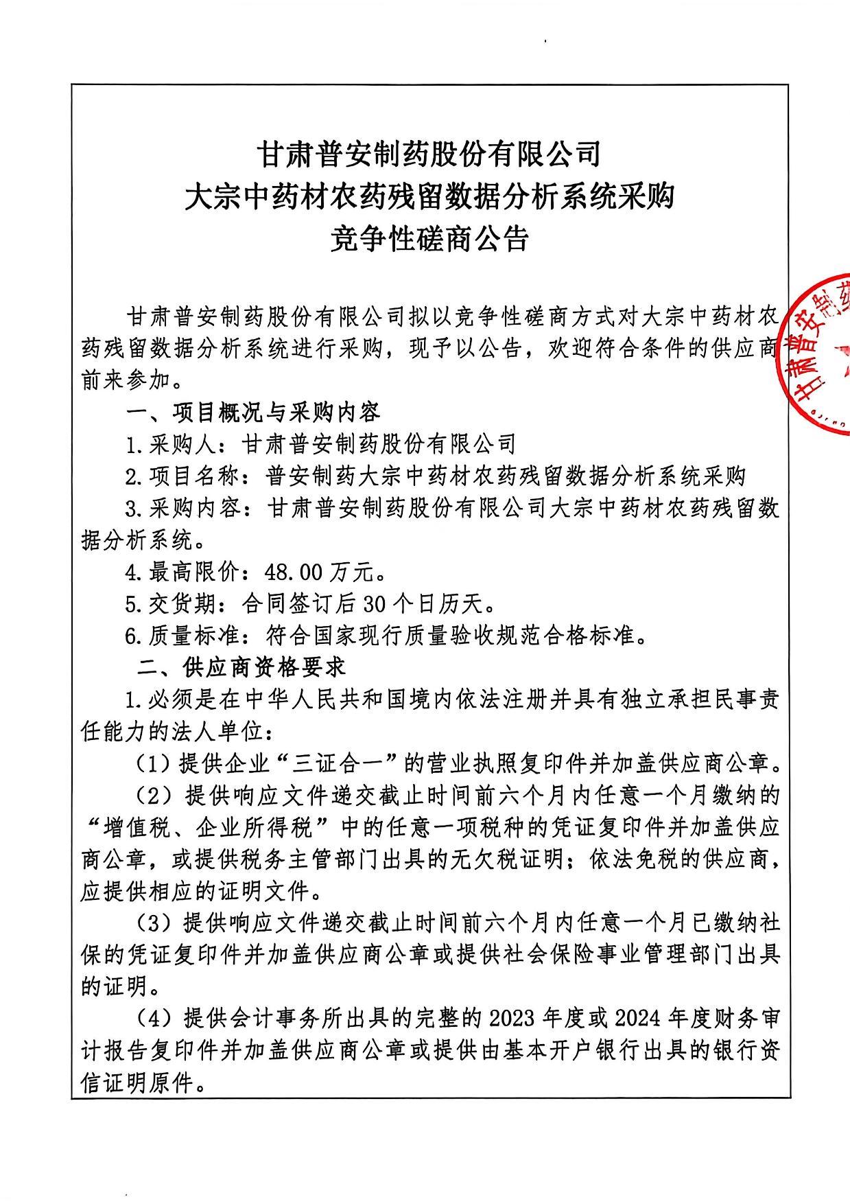 甘肅普安制藥股份有限公司大宗中藥材農(nóng)藥殘留數(shù)據(jù)分析系統(tǒng)采購(gòu)競(jìng)爭(zhēng)性磋商公告