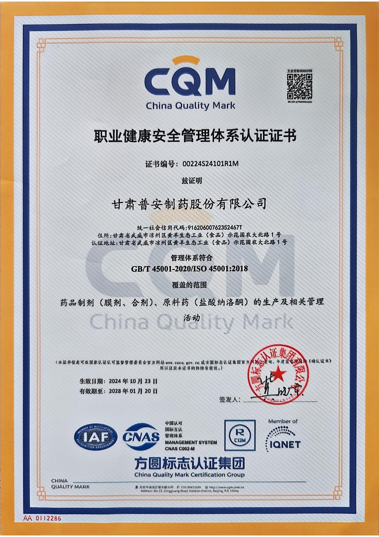 職業健康安全管理體系認證證書