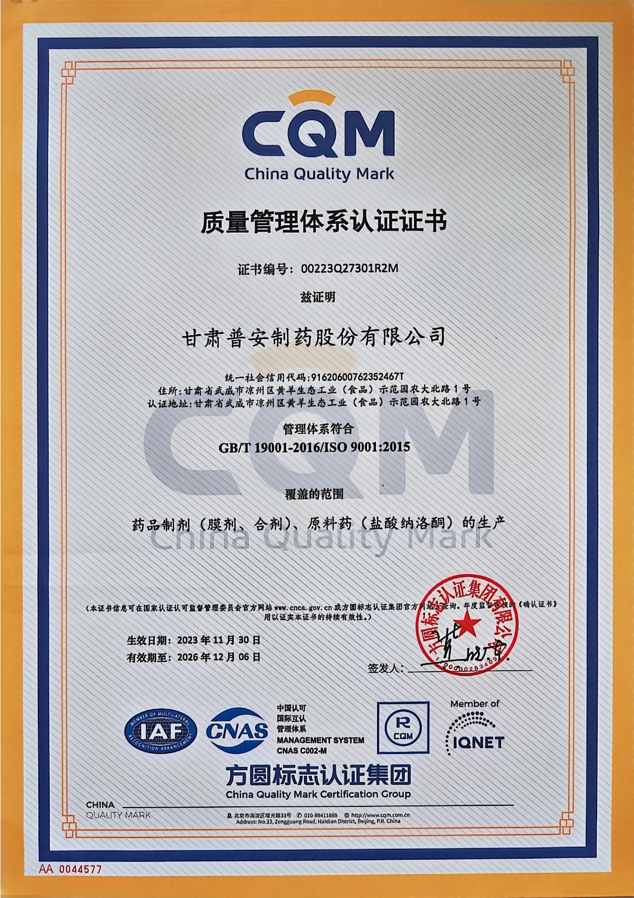 質量管理體系認證證書